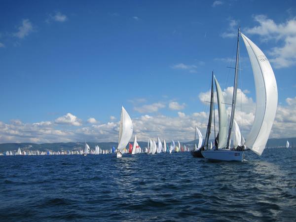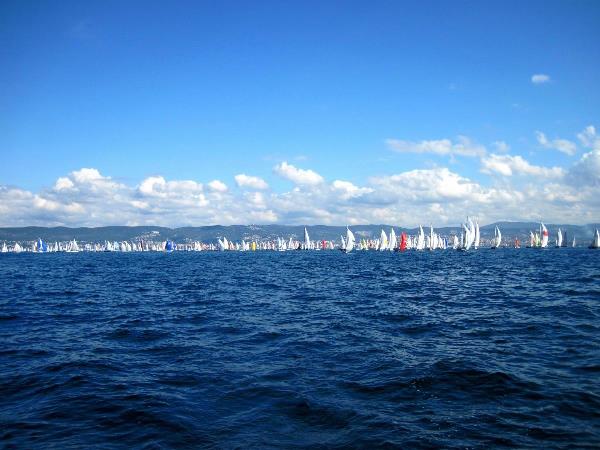 A nemzetközi csapat hiba nélkül teszi a dolgát. A trimmerek apatikus nyugalommal tűrik, hogy hárman - Dorina, Dino és én - három nyelven háromfélét diktálunk. Egész jól haladunk. Felegérkedünk az álldogáló rohanógépek vonaláig. Jó látni: mellettünk, igaz kicsit mélyebben az Esimit Európa 2, a Raffica, több TP52-esés 80 lábas maxik. Egy kis igazítás után kihúzzuk a takkot a pálya sarkáig, majd bal csapáson közelítjük az első bóját. Cseppet sem félelmetes, ahogy másfél ezer hajó érkezik jobb csapáson spinnakerrel a leterjedő szélben.