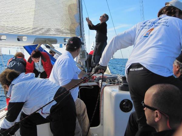 Kár, hogy nem beszélünk közös nyelvet, mert lenne igény tanácsra: a Kékszalagon is sokan vannak, de itt háromszor annyi hajó (1562 induló) osztozik fele hosszúságú rajtvonalon, köztük 80-100 lábas óriások.Nemzetközi csapattal indulunk, a kemény magot a nautikos Pingi team alkotja: Sándor (bow), Dorina (taktika, orrvitorlák), Boglárka (pit), Dávid (nagyvitora), Karesz (orrvitorlák, genakker), valamint a vendégművész András (mast) és Blanka lányom (backstag, navigátor). Dino, az előző tulaj ígért még négy gyakorlott férfit, de végül csak 3 amatőr házaspárt láttam érkezni: Dino (afterguard)és Renée, Mario (bow) és Edit, valamint Andrea (pit) és Cristina (backstag).A rajtig mindenki járatja a motort biztonsági okokból, sokan használják is, ezért a vitorlások mozgása teljesen kiszámíthatatlan. Az olaszok lazán kezelik a helyzetet, a legkisebb helyre is beteszik a hajót, kiabálnak, integetnek, de senki sem ingerült. Mintha Róma belvárosában autóznánk a pénteki csúcsforgalomban.