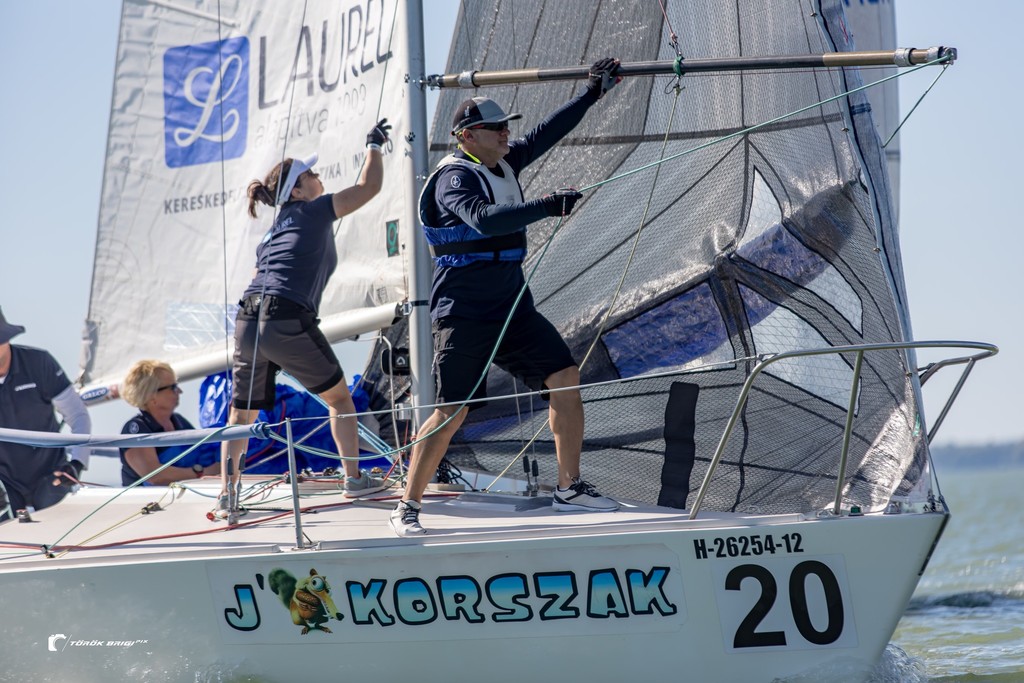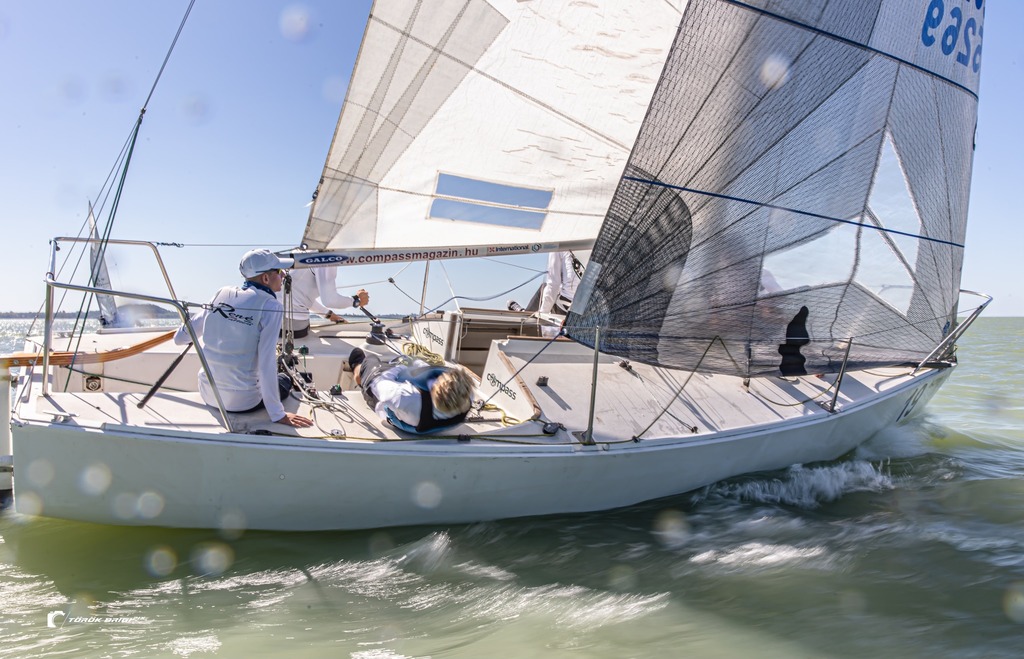 Rendesen fütyült a szél a kikötőben, amikor ellöktük a partot. A terv az volt, hogy lehátszelezünk a csőig, közben néhány halzolással összehangoljuk a csapatmunkát. A 25+ csomós alapszél változtatott a koncepción. A perdülések elmaradtak, így jelentős anyagi kár, és megtépázott önbizalom nélkül jutottunk át a Nyugati medencébe. Előre csak a fockot húztuk fel, így is rendesen spriccelt, amíg Révfülöp alá nem értünk. Az elgémberedett csapatot kicsit átmozgattam, és kikötés helyett lehátszeleztünk a Déli partra. Megszámlálhatatlanul sokat halzoltunk, de mire leértünk, szinte hibátlan manőverekre voltunk képesek. „Megy a hajó, irány Észak, vidámak a tengerészak” mormoltam magamban, miközben fordulóról fordulóra csiszolgattuk a technikánkat. Közkívánatra a révfülöpi kikötő előtt génuára szereltünk és újra ledöngettünk. Szegény Zoli - aki ilyet még soha nem csinált – már alig állt a decken az újabb halzolások, a ki-be akasztások tömeges gyakorlásának következtében. Mire ismét elértük a kikötőt, megtanultuk hogyan érdemes génuával fordulni, megtapasztaltuk, hogy a legénységnek könnyebb lábbal előre átcsusszanni, sőt a fock sínen is megtaláltuk az ideális behúzó pontot. Másnap a versenyen még kitartott a lendület, egy parádés 5. hellyel mutatkoztunk be. A folytatás nem volt ennyire látványos, bár volt még tízen belüli helyünk, de végül a 12. helyen zártuk a Bajnokságot.