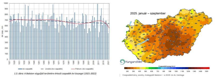 De mi is a konkrét helyzet: A Balatonból 2025. októberi adatok szerint több mint 300 millió köbméter víz hiányzik a 120 centiméteres szabályozási szinthez képest. Ez nagyjából 66 centiméteres vízszintet jelent, ami a nyári aszály és intenzív párolgás miatt állt elő. A szükséges vízmennyiség pótlásához átlagosan 170 milliméternyi csapadékra lenne szükség a tó vízgyűjtő területén.