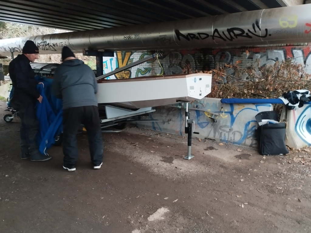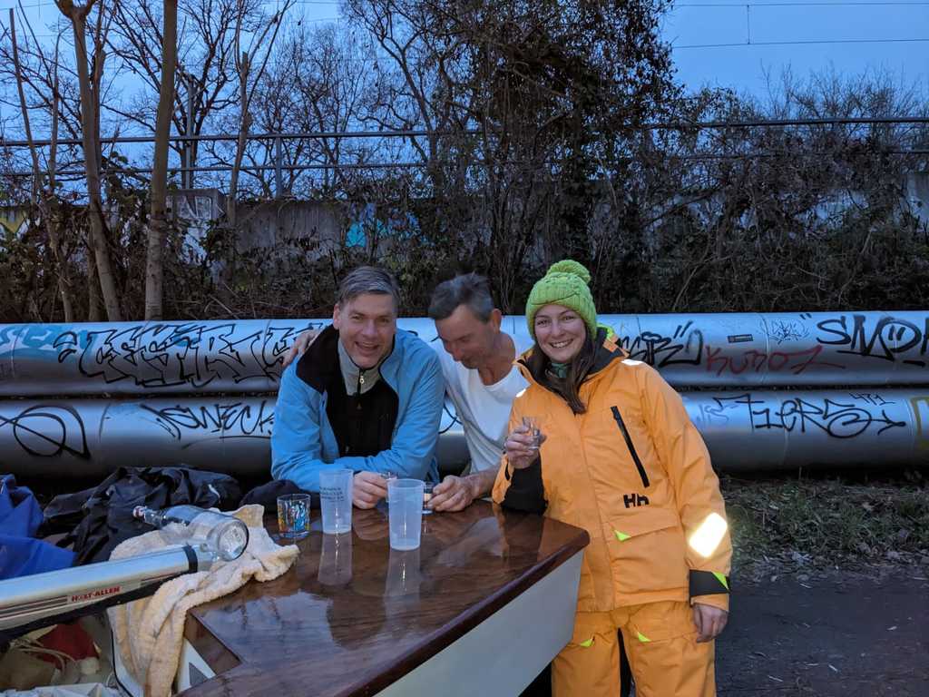 Rövid hezitálást követően péntek hajnali 1.30 körül indultunk, valahol egy cseh pihenőnél szunyáltunk fél órát és 13.30 körül már raktuk is össze a hajót a híd alatt, ahol közel 20 éve nem volt magyar hajó.
