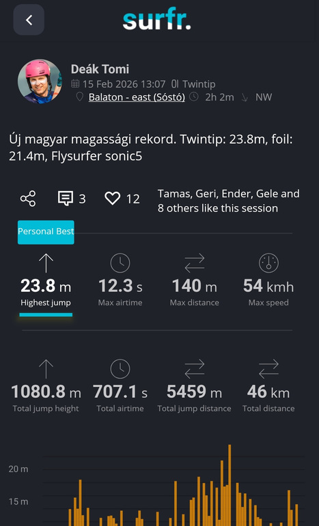 A történet érdekessége, hogy a rekordkísérletek már délelőtt beindultak: Tóth Gele Balatonfenyvesnél próbált rá egy igazán nagy ugrásra, és 19,5 méterig jutott, de ez még nem volt elég Deák Tomi korábbi 20,6 méteres rekordjához képest. Tomi eközben nem kapkodott, kivárt a délutáni órákig, amikor a felhőzet már felszakadozott, és a szél stabilabbá vált. Ahogy ő fogalmazott: nem rekordra készült, hanem kis ernyős felszerelést akart tesztelni stabil, erős szélben, ezért választotta a délutánt.