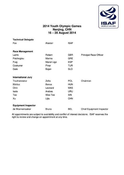 Az ISAF közzétette a 2014. augusztus 16 és 28 között a kínai Nanjingban rendezendő ifjúsági Olimpiai játékok nemzetközi rendező és zsűritagjait, melynek soraiban egy magyar bíró neve is szerepel.